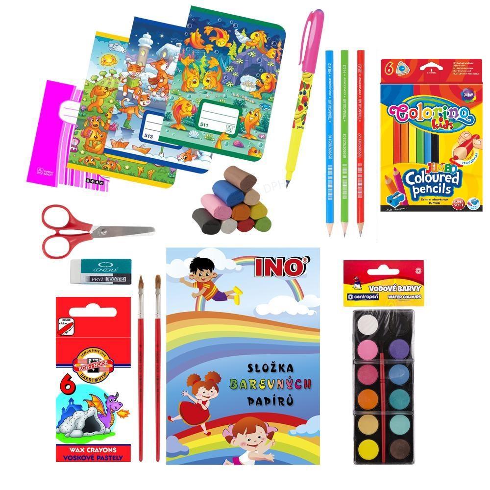 Balíček pro školu obsahuje tyto položky po jednom kuse Nůžky dětské 901B pro praváky Barvy vodové 12 odstínů Štětec kulatý bar. č. 10 Štětec plochý bar. č. 10 Pastelky Kores trojhranné Jumbo 06 ks + ořezávátko silné Pastelky voskové KIN 8231/06 Modelína 10 barev Tužka grafitová trojhranná č. 1 Tužka grafitová trojhranná č. 2 Tužka grafitová trojhranná č. 3 Popisovač TORNADO FRUITY Papíry barevné složka A4, 20 listů Sešit bezdřevý 511 - A5 linkovaný, 10 listů Sešit bezdřevý 512 - A5 linkovaný, 10 listů Sešit bezdřevý 513 - A5 linkovaný, 10 listů Sešit EKO 644 - A6 linkovaný, 40 listů Pryž