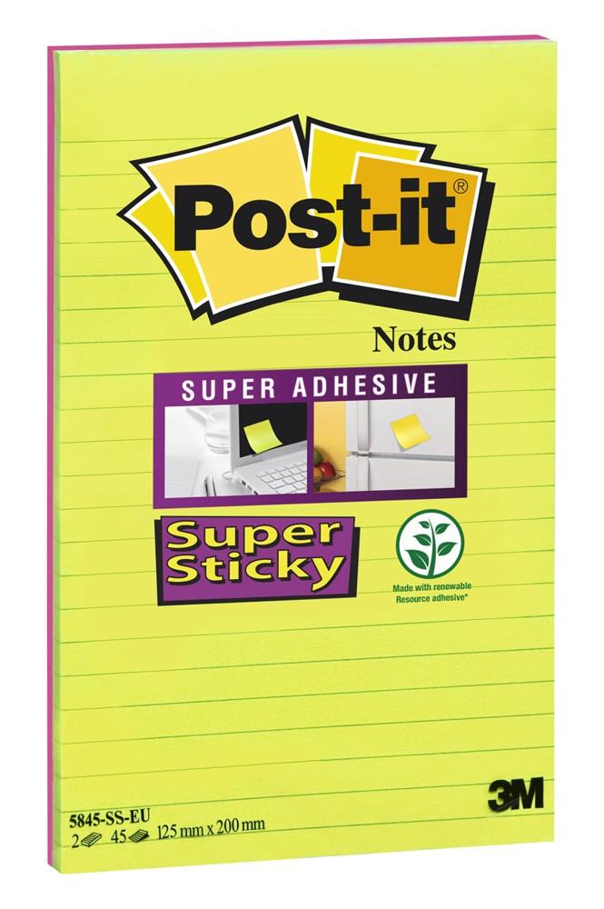 Blok linkovaný silně lepicí Extra silné lepidlo je dělá lepivějšími a silnějšími než originální Post-it® bločky Super silné lepidlo vydrží déle i na vertikálních plochách Rozměr: 125 x 200 mm Balení: 2 x 45 lístků