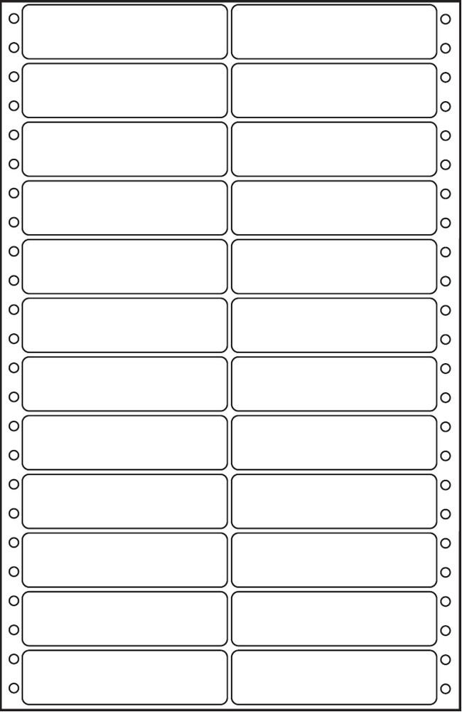 Počítačové samolepící etikety umístěné na "nekonečném" pásu skládaných listů (tzv. skladů) Jsou opatřeny postranní vodící perforací Určeny především pro potisk v mechanických počítačových tiskárnách Jsou dodávány standardně v bílé barvě Rozměr: 90 x 23 mm