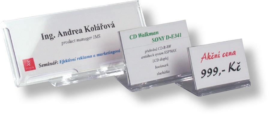 Elegantní stolní identifikátor vyrobený z průhledného pevného plexiskla se skládacím podstavcem Na čistou předlohu lze napsat jméno nebo použít vizitku Lze použít i jako nosič textů, popisů nebo cenovek na výstavách Prodejní jednotka 1 ks