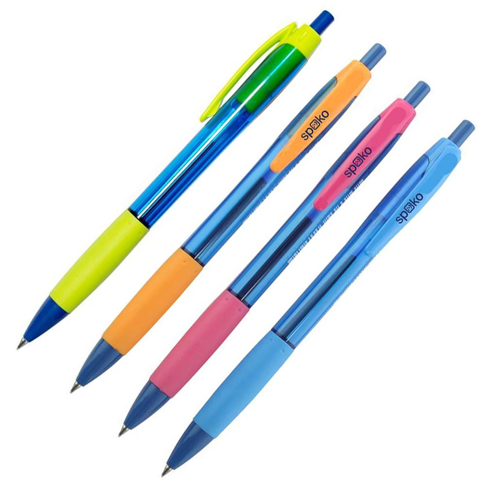 Plastové kuličkové pero Modrá náplň Pogumovaný barevný úchop Pohodlné držení a psaní Modré částečně průhledné tělo Barevný úchop a grip v neon. barvách Šířka stopy: 0,5 mm