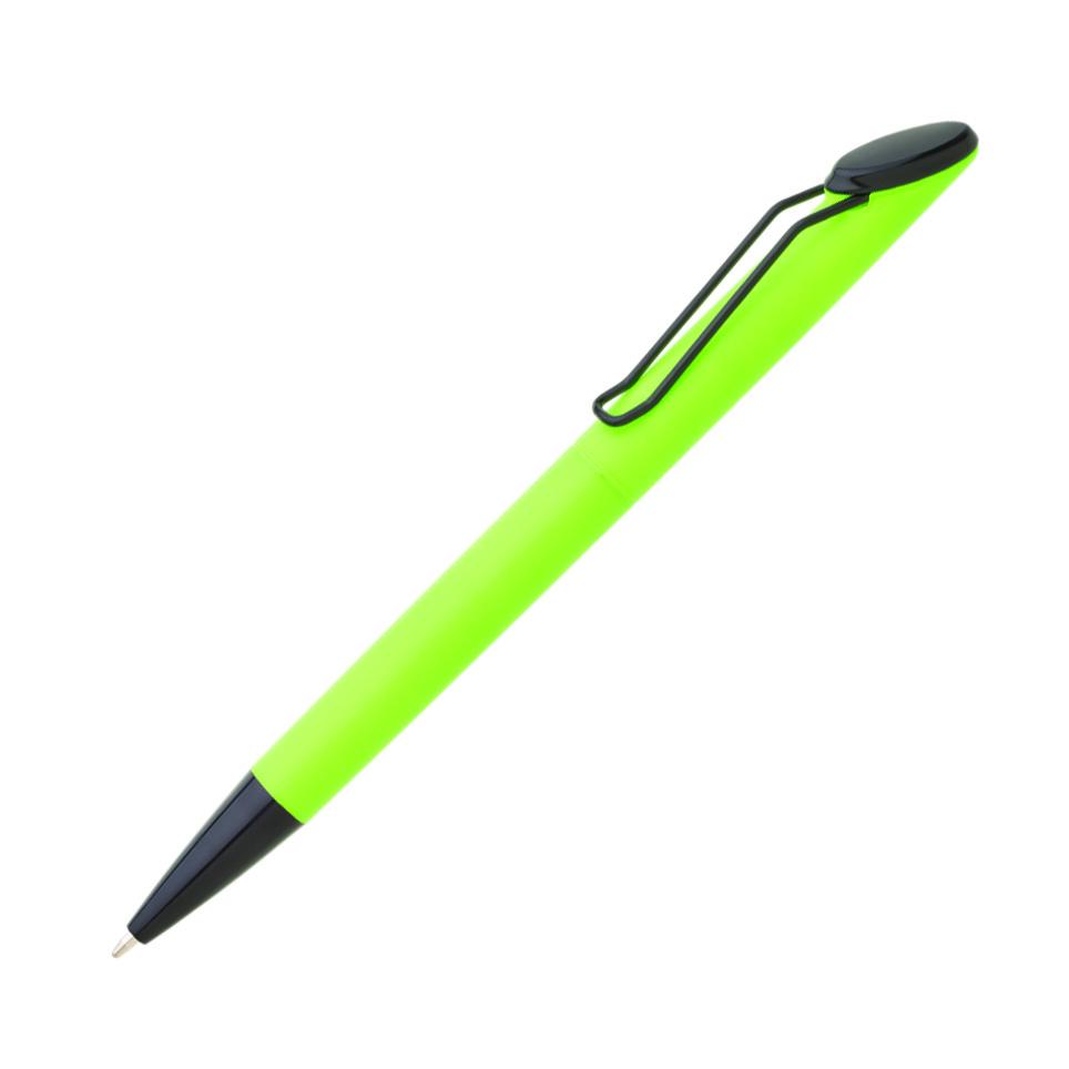 Plastová otočná propiska ARESTA v neonových barvách s černou špičkou a černým kovovým klipem Náplň velkoobsahová, modře píšící
