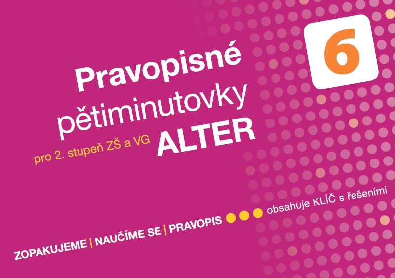 První titul z řady pravopisných pětiminutovek ALTER pro 2. stupeň ZŠ a VG slouží k efektivnímu procvičování pravopisu. Koncepčně navazuje na Pětiminutovky ALTER pro 1. stupeň. V pracovním sešitě se střídají cvičení ve tvaru sloupců a bloků na plnou šířku strany; grafická podoba je k žákům vstřícná. Sešit na příslušné úrovni procvičuje (včetně různých záludností): vyjmenovaná slova; psaní předpon, skupin bě – bje, vě – vje, pě, fě, mě – mně, písmen u – ú – ů, n – nn, párových souhlásek a velkých písmen; koncovky a tvary podstatných a přídavných jmen; koncovky sloves (shoda přísudku s podmětem, přítomné tvary, rozkazovací způsob); stupňování přídavných jmen; zájmena; číslovky; psaní čárky; obsahuje také 6 textů pro korekturu.