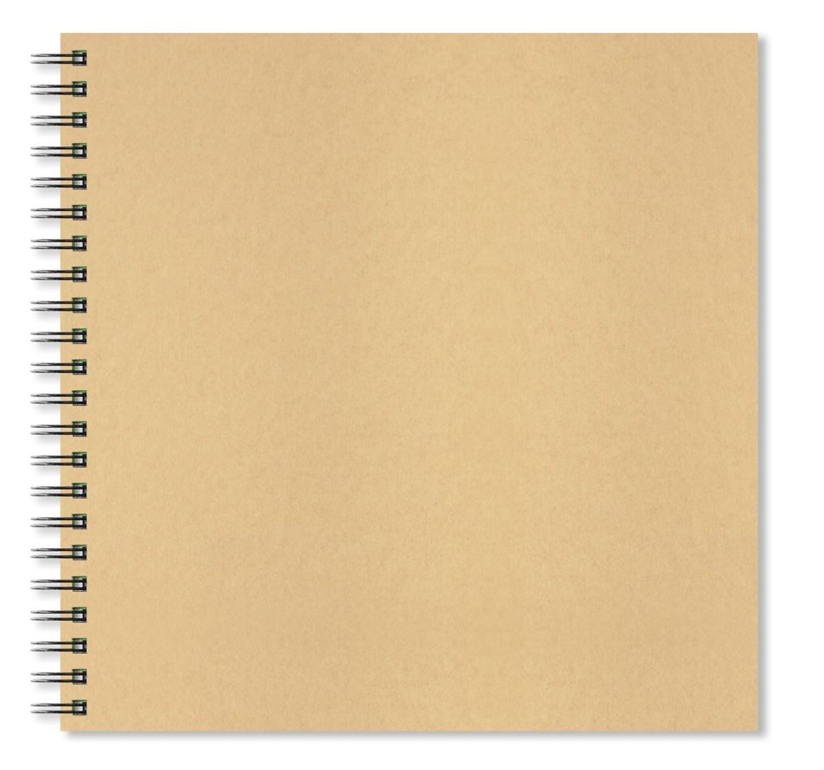 Vysoce odolné přírodní desky (kraft papír) Bez log/značek pro vlastní originální design přebalu 40 bílých listů 150 g/m2 Ideální pro suché techniky Dvojitá drátěná spirála Certifikace FSC