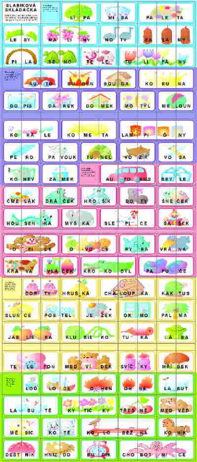 Hra je určena dětem v první třídě ZŠ a pomáhá při výuce slabikování. Po rozstříhání obrázků děti hledají správné části obrázku a přitom si zafixují slabiku na části obrázku. Obtížnost slov vzrůstá od modrého pozádí, přez fialové, růžové, žluté, až k zelenému. Lze proto zpočátku pracovat jen s první (druhou...) částí hry. Postup obtížnosti (včetně barev pozadí) koresponduje nejlépe s postupem výuky ve slabikáři od našeho vydavatelství. Další vhodné hry pro tuto věkovou kategorii jsou Počítej a hrej, Hrajeme si s písmenky a Pexeso "Pohádková abeceda".