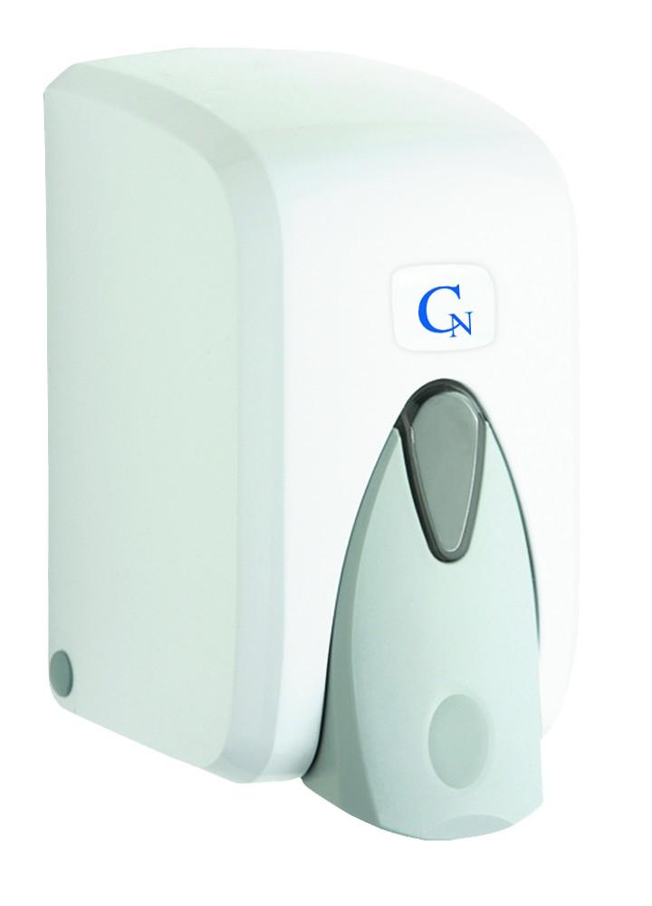 Nástěnný dávkovač na tekuté mýdlo Vyroben z bílého ABS plastu s šedivým tlačítkem Lze montovat na vruty i samolepky Prodejní jednotka 1 ks