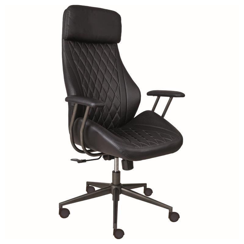 Pohodlné kancelářské křeslo s kvalitní synchronní mechanikou. Nastavení tuhosti mechanismu dle tělesné váhy uživatele s možností blokace ve zvolené poloze. Čalouněné koženkou černé barvy s drobnou perforací umožňující optimální větrání. Kovový kříž a kovové područky s čalouněným topem.