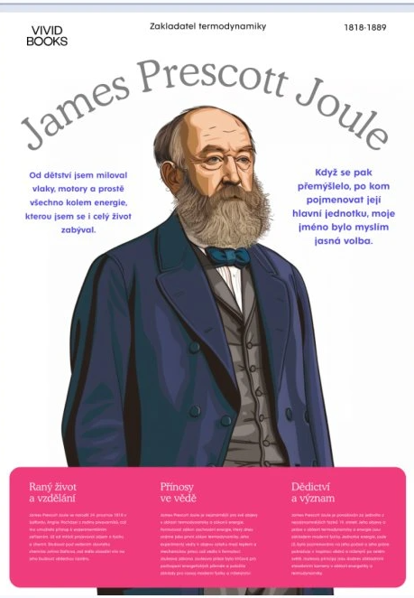 Tento plakát představuje jednoho z nejvýznamnějších fyziků 19. století, Jamese Prescotta Joulea. Jeho objevy v oblasti termodynamiky, zejména zákon zachování energie a Jouleův zákon, zásadně přispěly k pochopení energetických přeměn a vytvořily základy pro moderní fyziku. Na jeho počest byla pojmenována jednotka energie – joule (J).
