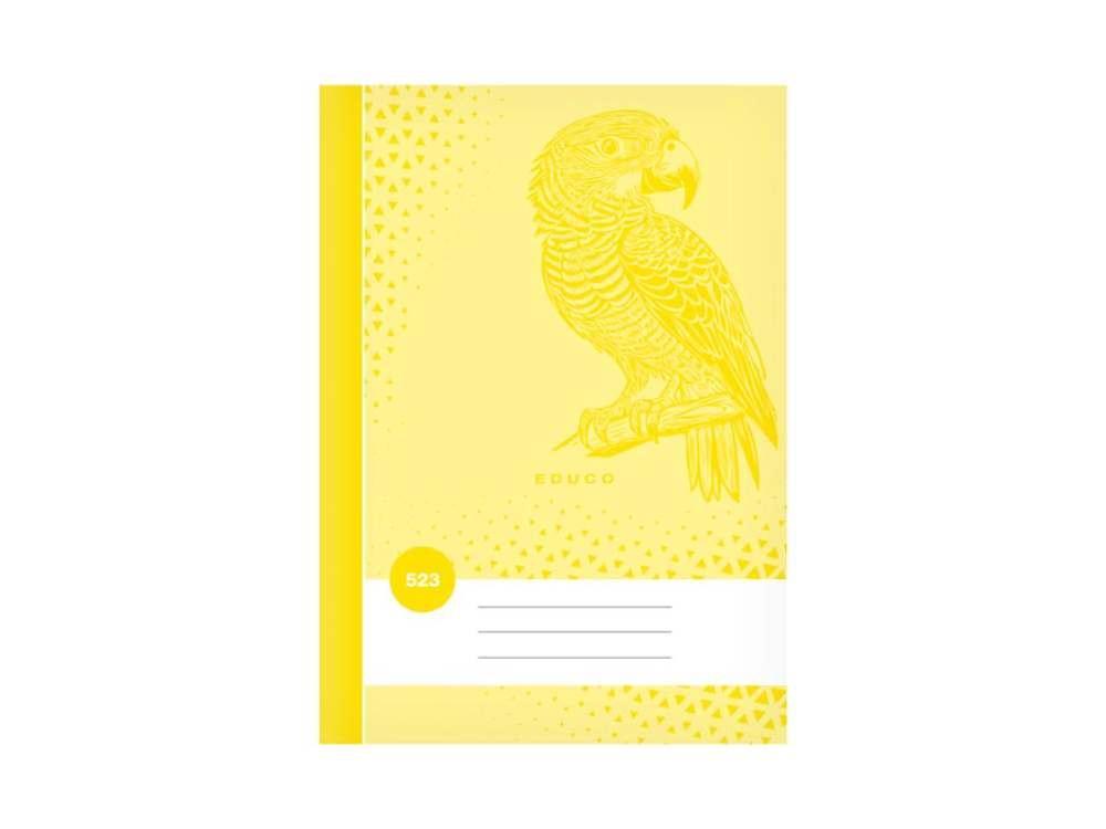 - Školní linkovaný sešit ve formátu A5, v žluté barvě, s motivem papouška, v deskách z křídového papíru