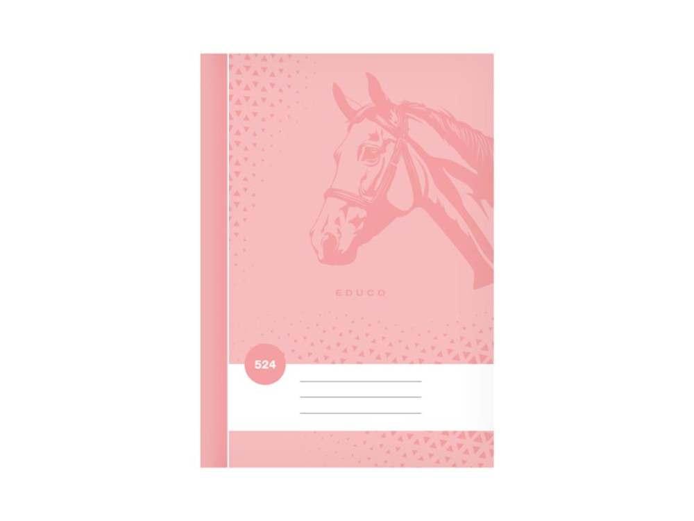 - Školní linkovaný sešit ve formátu A5, v růžové barvě, s motivem koně, v deskách z křídového papíru